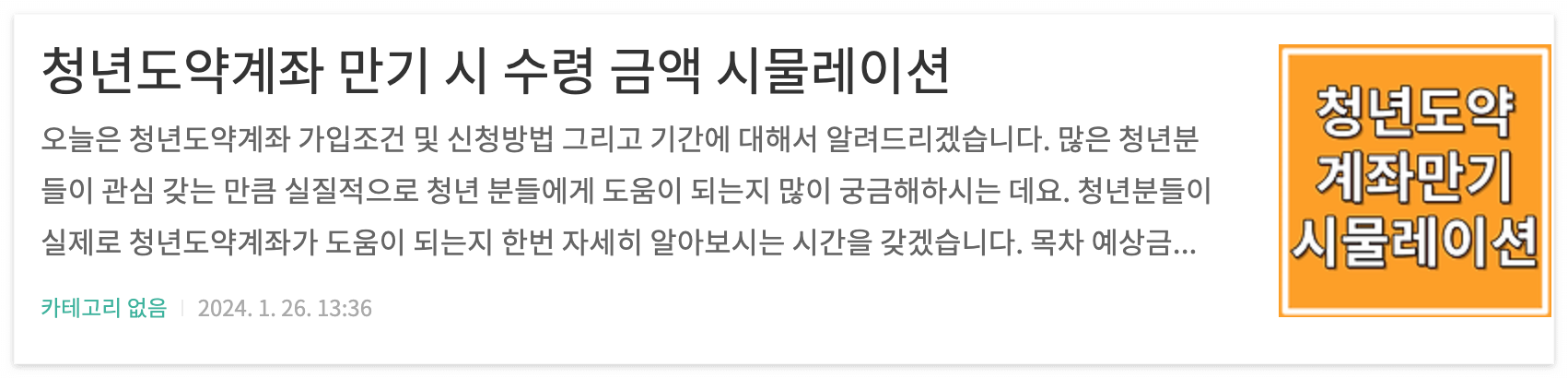 청년도약계좌 가입과 청년희망적금 중복가입이 불가능했기 때문에, 청년희망적금을 가지고 있던 분들은 청년도약계좌 가입이 불가능했었습니다. 그러나 만기자를 대상으로 만기금액을 청년도약계좌에 일시금으로 납부를 하게 되면 위 사진처럼 처음부터 청년도약계좌에 가입했던 분들보다 더 큰 수익을 얻게 됩니다. 여기에 별도로 은행 금리 혜택을 추가로 받으시면 이자 수익은 더 늘어나게 됩니다.